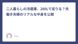 冷蔵庫 二人暮らしの冷蔵庫、280Lで足りる?共働き夫婦のリアルな中身を公開 2026-04-20 うたの ※この記事にはアフィリエイトリンクが含まれています。リンク経由で購入いただくと、運営費として収益の一部を受け取る場合があります。記事の内容 …